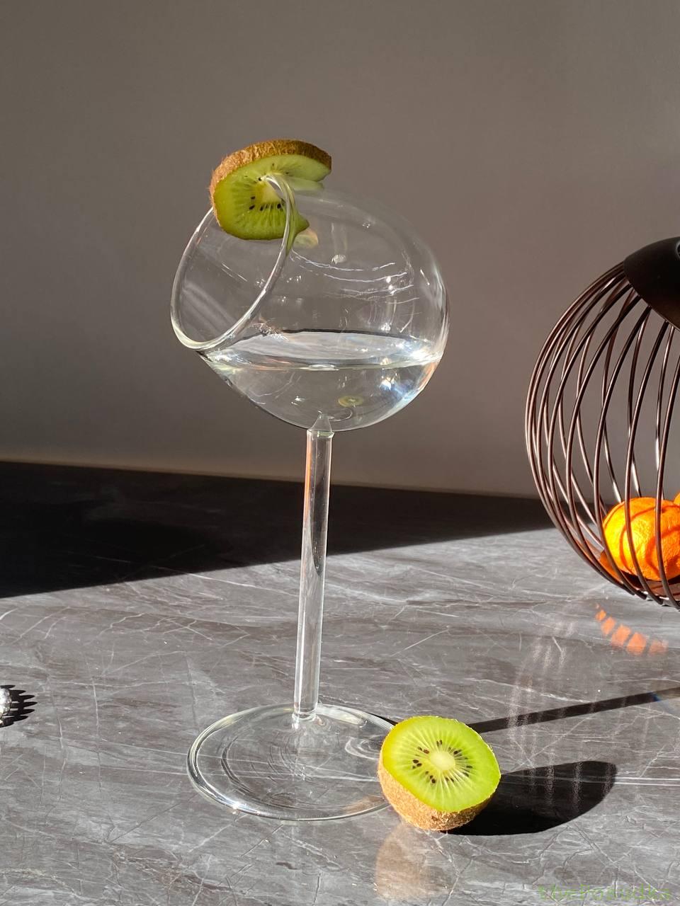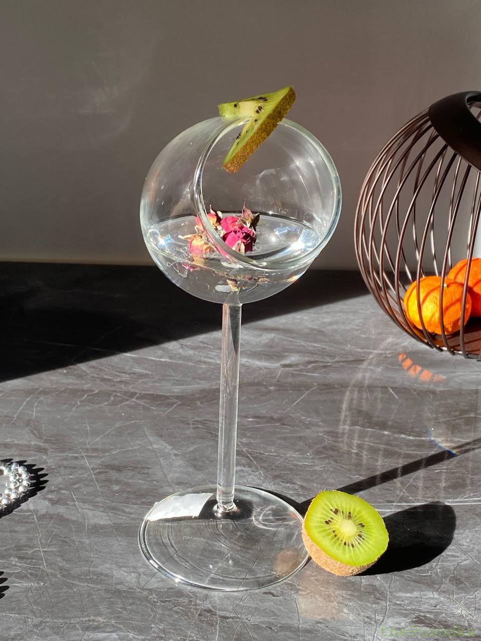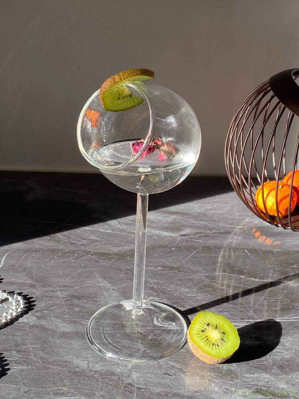 Келих “Ефір” вражає своєю авангардною конструкцією – сферична чаша розташована під кутом до ніжки, створюючи ефект левітації та невагомості. Ця унікальна геометрія дозволяє напоям та декору “парити” всередині, створюючи неймовірно ефектну презентацію. Широке бічне отвори ідеально підходить для розміщення гарнірів, сухоцвітів, фруктів та інших декоративних елементів.