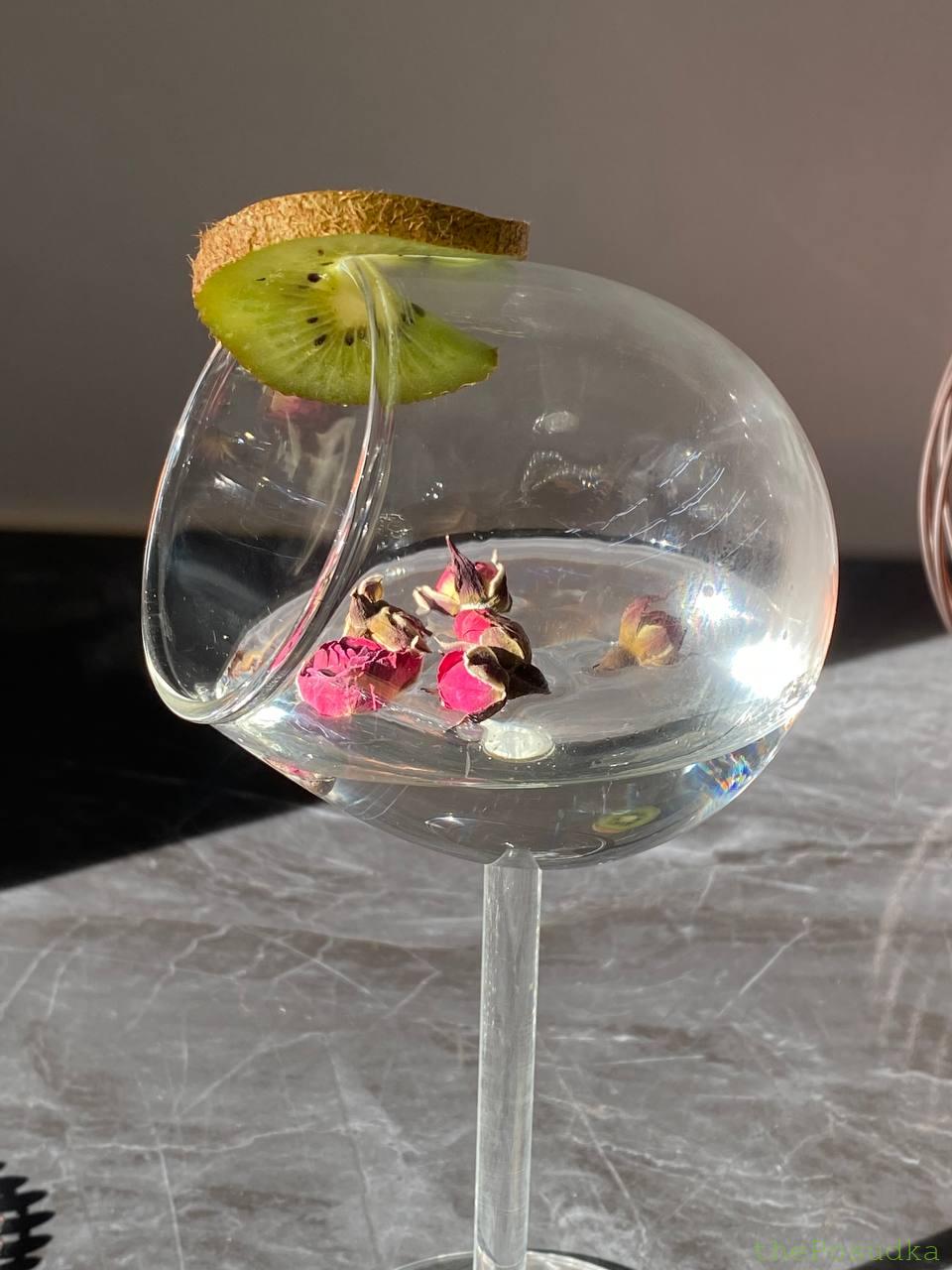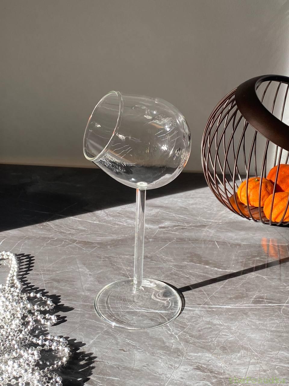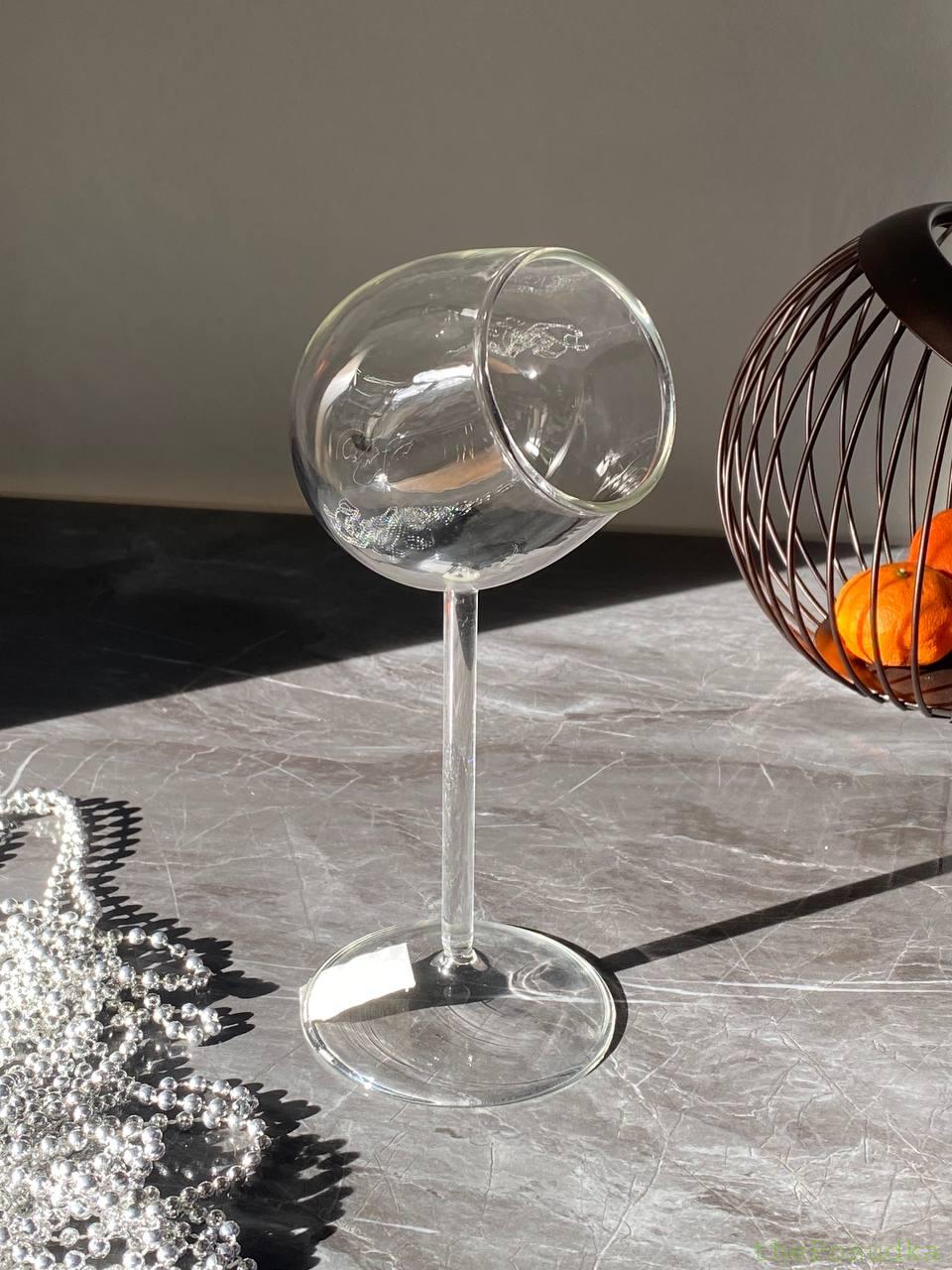 Келих “Ефір” вражає своєю авангардною конструкцією – сферична чаша розташована під кутом до ніжки, створюючи ефект левітації та невагомості. Ця унікальна геометрія дозволяє напоям та декору “парити” всередині, створюючи неймовірно ефектну презентацію. Широке бічне отвори ідеально підходить для розміщення гарнірів, сухоцвітів, фруктів та інших декоративних елементів.