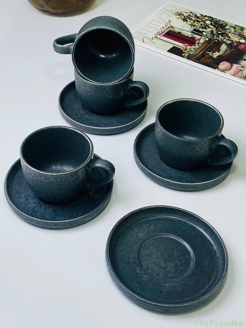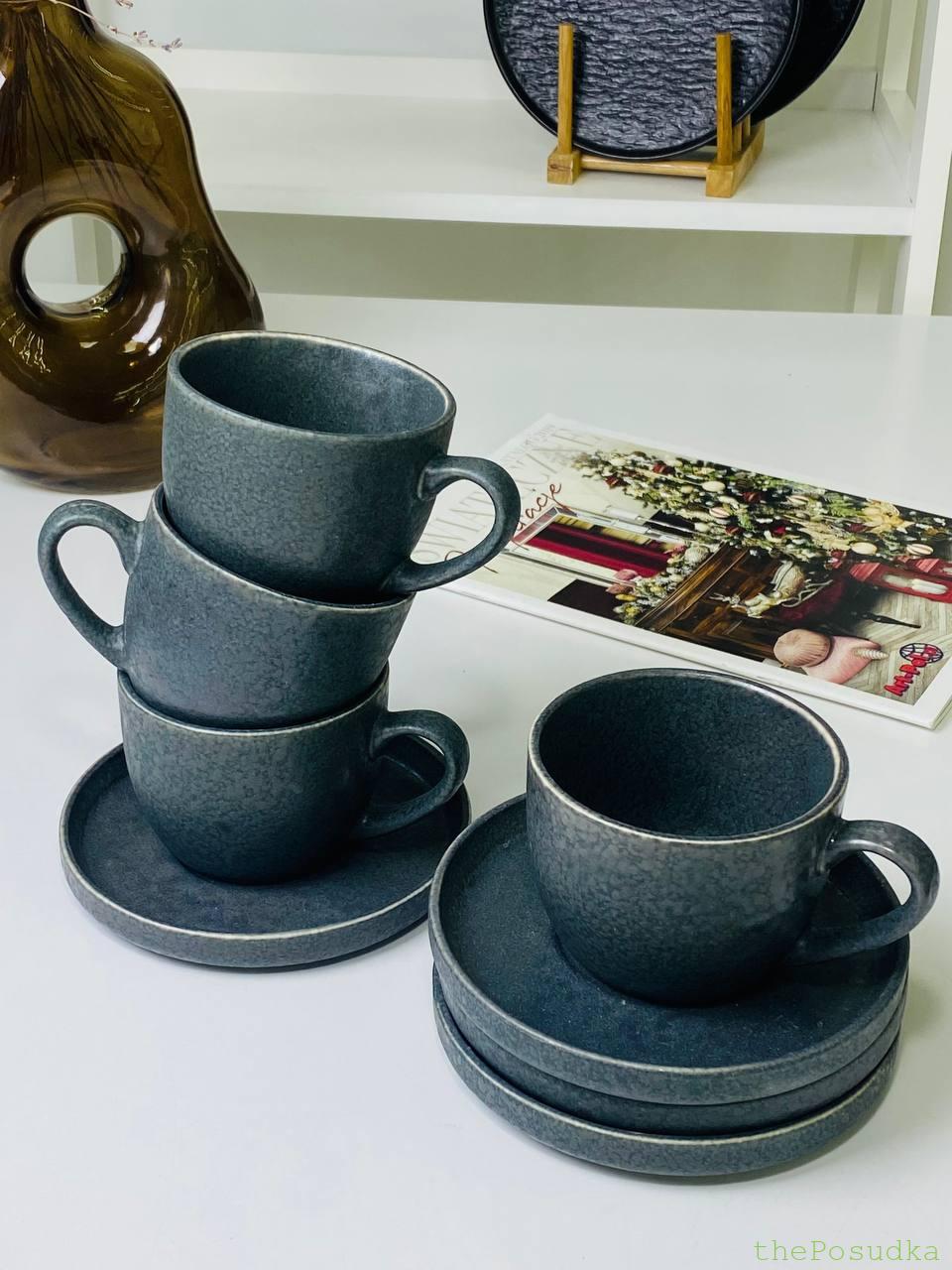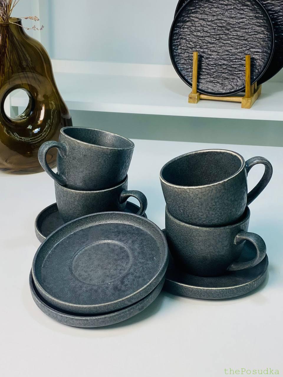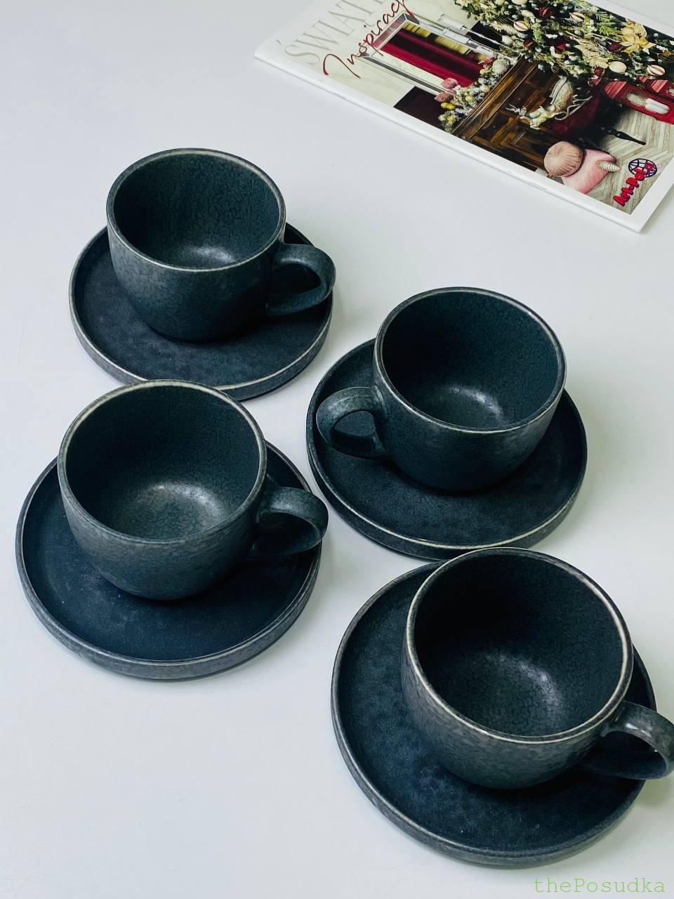 Чотири чашки з блюдцями у глибокому темно-сірому відтінку. Матова фактурна поверхня з плямистим ефектом – кожна чашка трохи унікальна. Тонкий світлий обідок по краю додає витонченості.