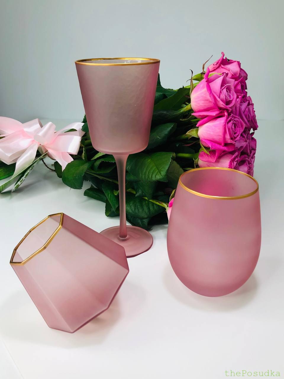 - Матеріал: матове кольорове скло (dusty pink) з золотим декором