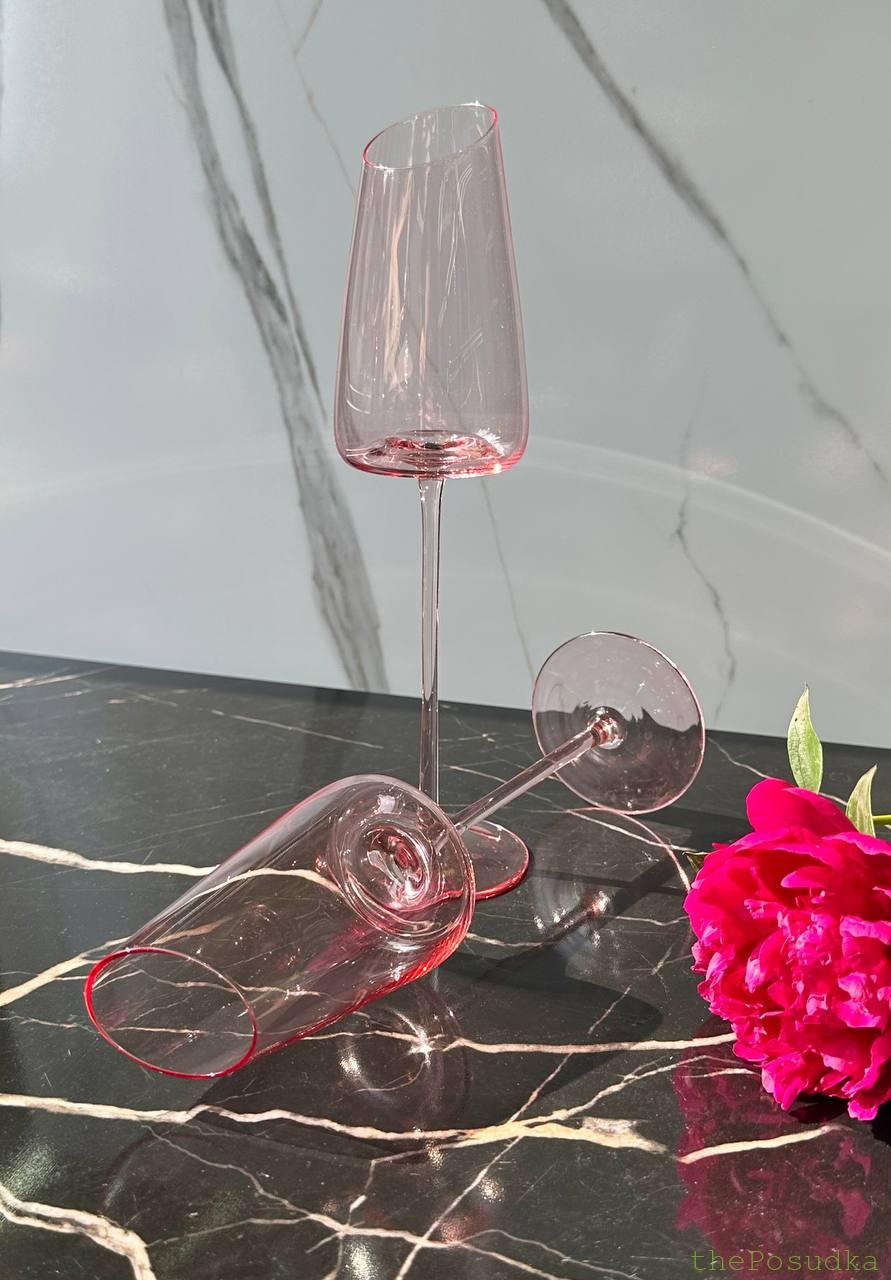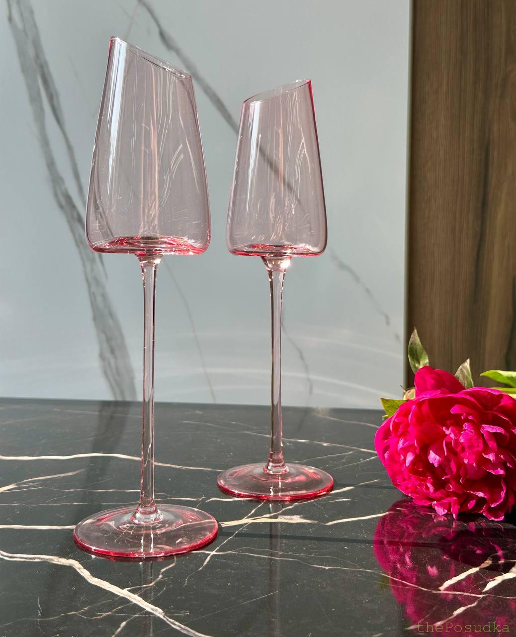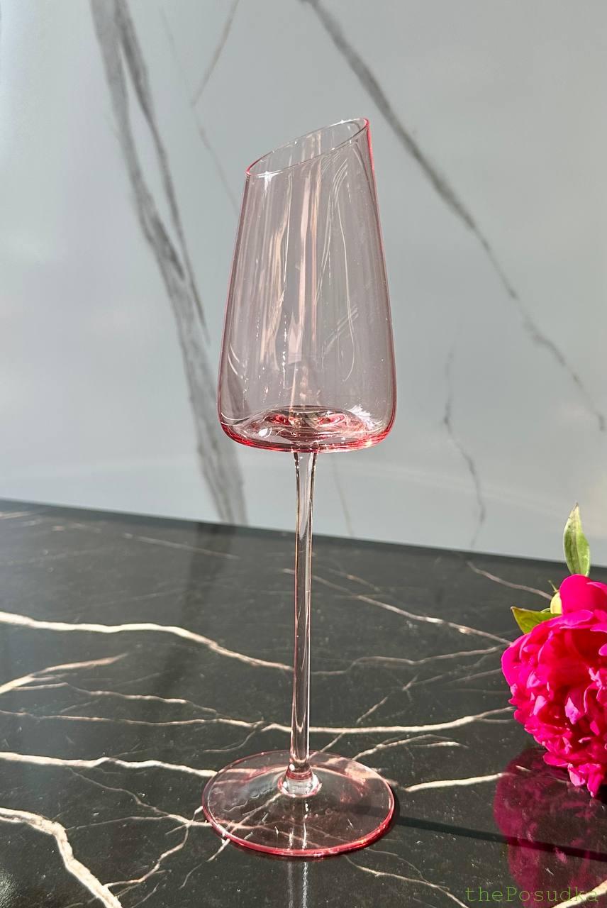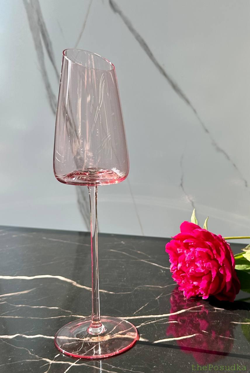 Асиметричний зріз чаші, елегантна висока ніжка — “Пінк-едж” виглядає як келихи з модних показів. Це не просто флюти для шампанського, це аксесуар, який додає гламуру будь-якому тосту. Асиметричний край ловить світло, створюючи ніжний акцент.