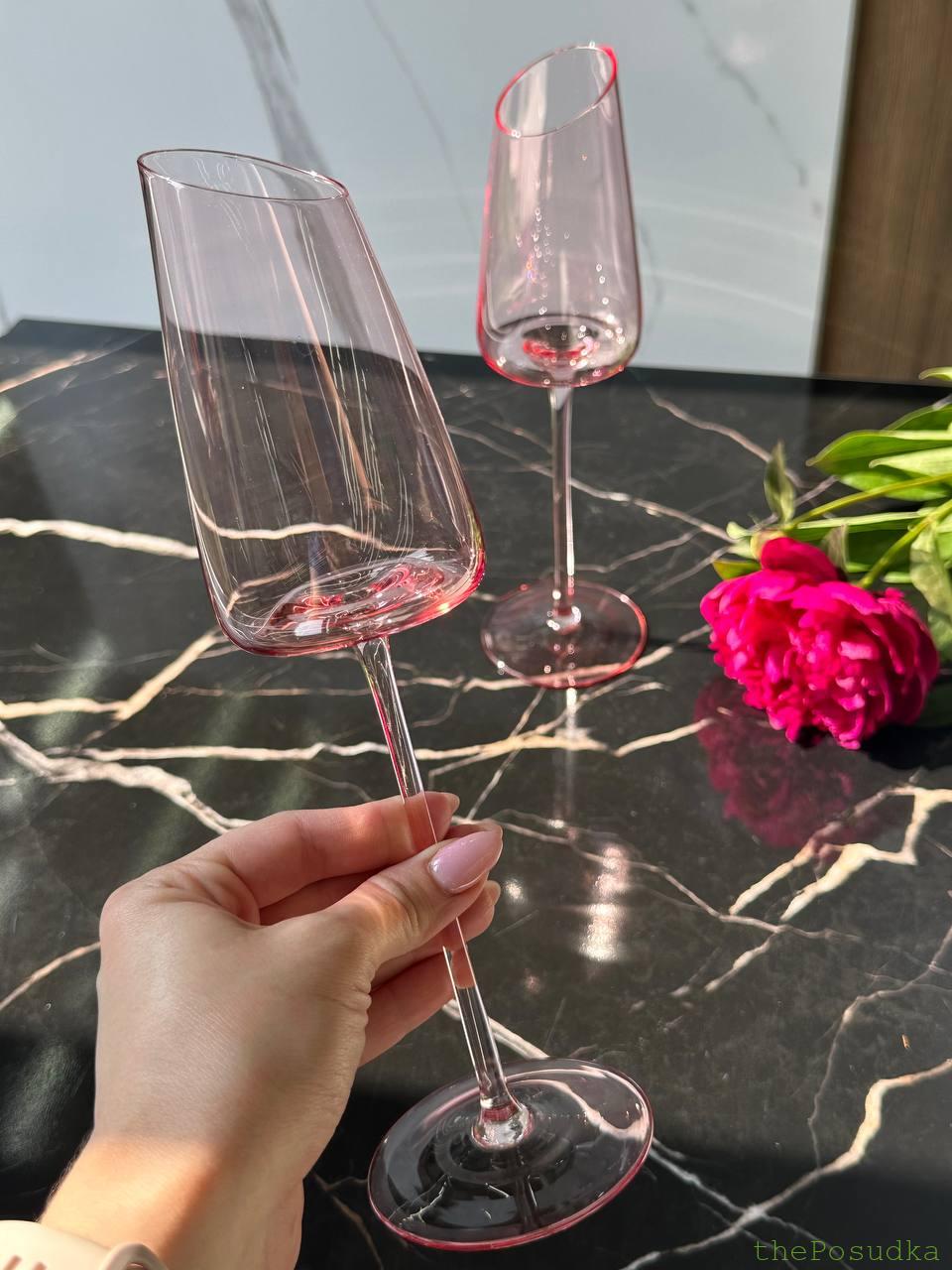 Прямі лінії — класика. Асиметрія — сучасність. Зріз під кутом робить “Пінк-едж” менш формальними, більш розслабленими, трендовими. Це келихи для тих, хто слідкує за модою в дизайні.