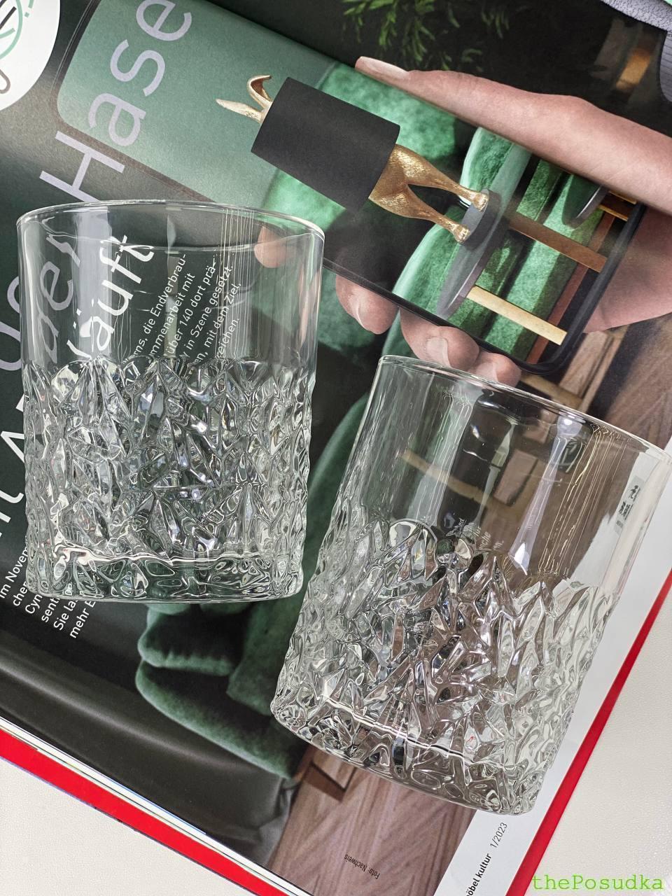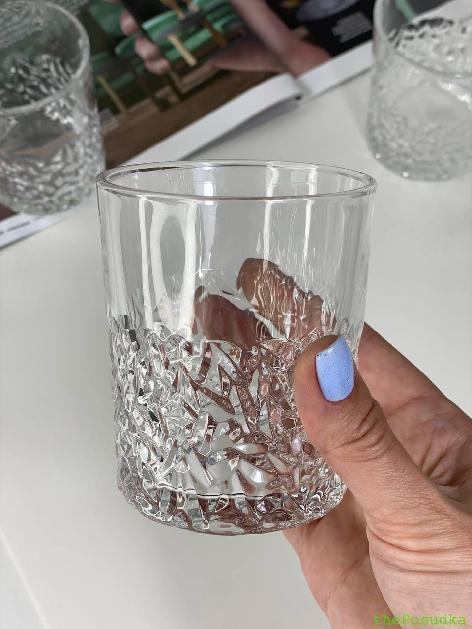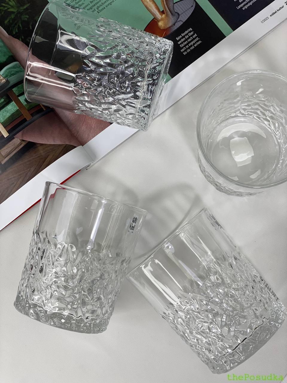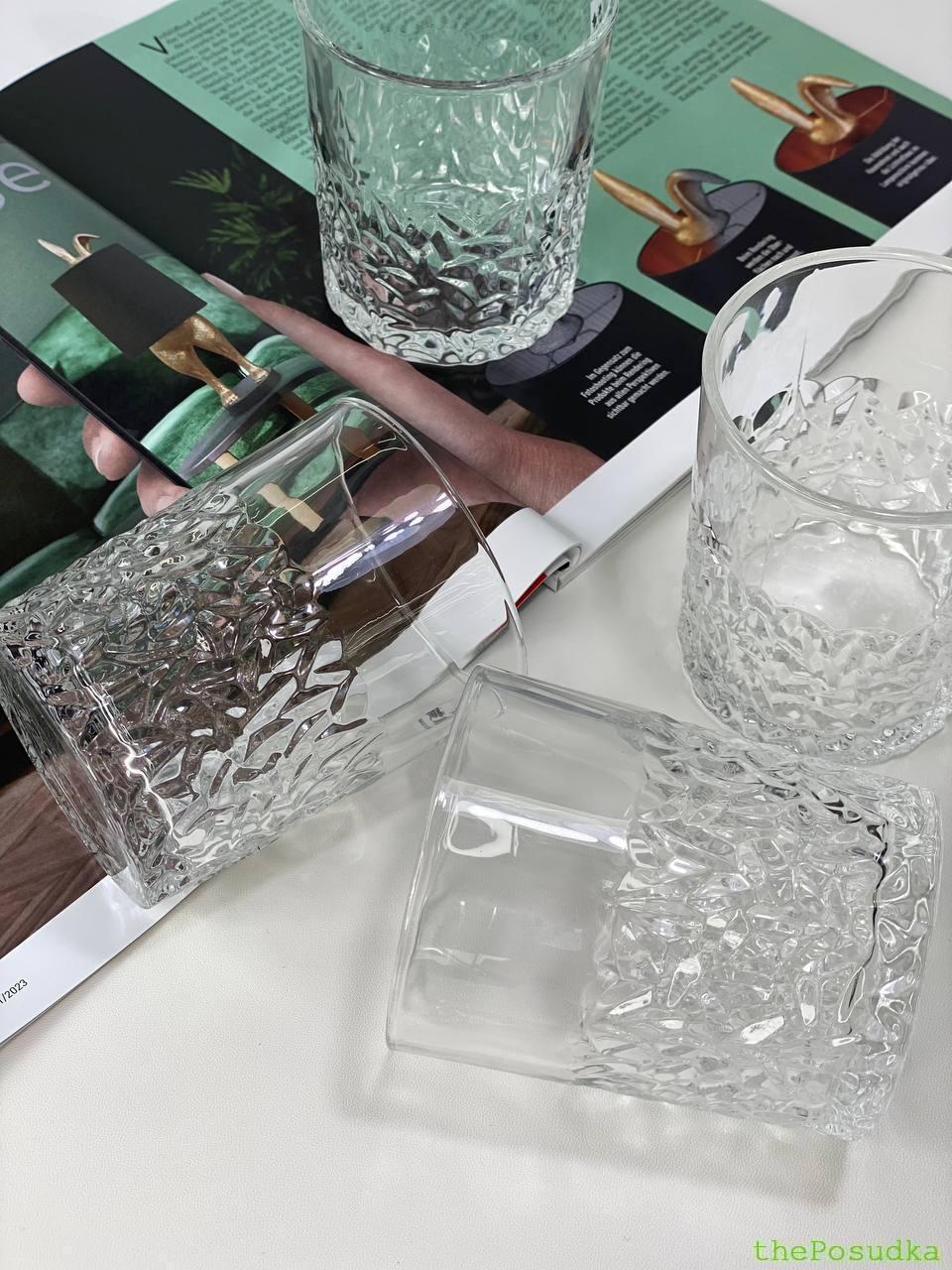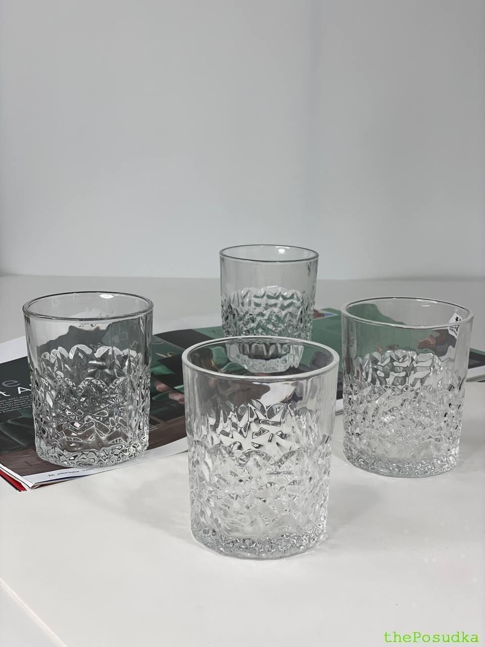 Дизайн: Склянки виконані з прозорого скла з витонченим рельєфним візерунком, що нагадує опаловий камінь. Їхній стильний вигляд стане справжньою окрасою вашого столу.