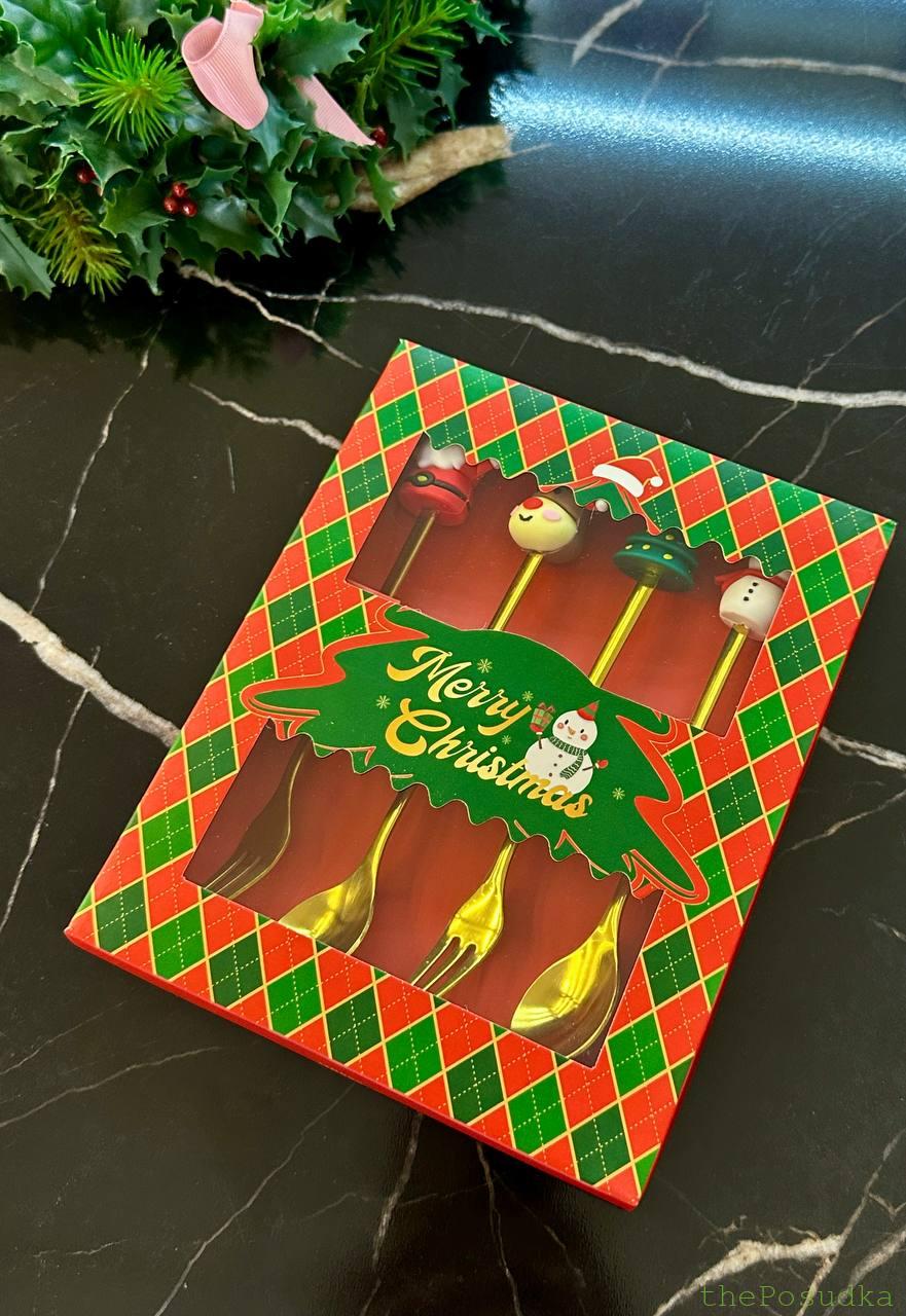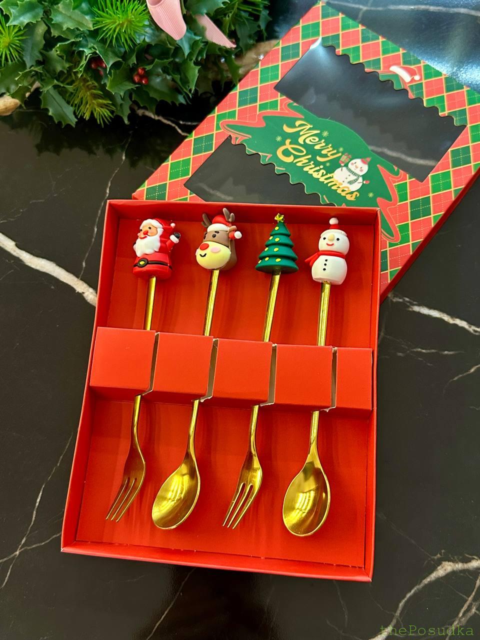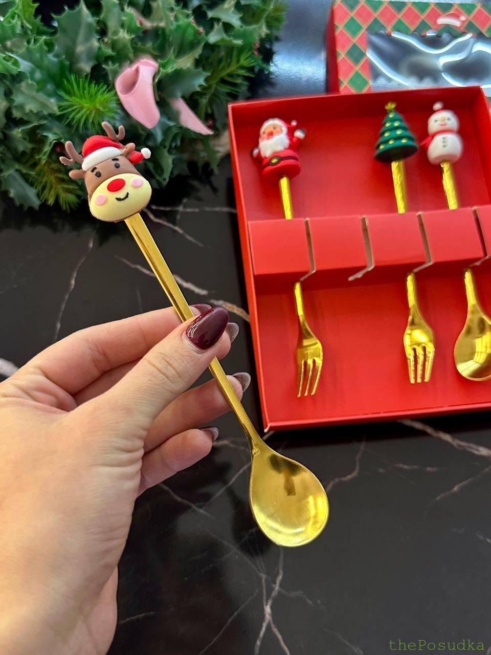 Святковий набір столових приборів з новорічними фігурками перетворить звичайну трапезу на справжнє свято. Комплект складається з двох ложок та двох виделок, кожна з яких прикрашена об’ємною фігуркою улюбленого різдвяного персонажа.