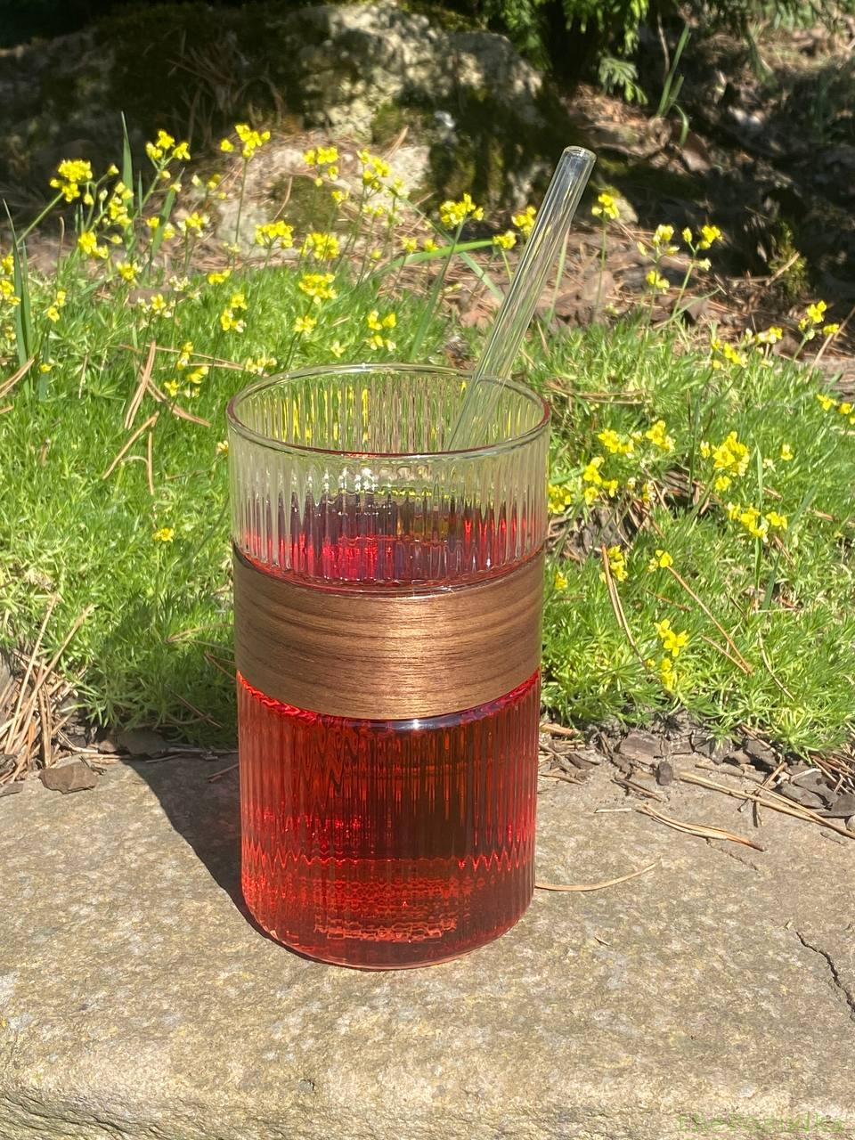 Комбінація скла та дерева. Верхня та нижня частини — прозоре скло з вертикальними канелюрами. А посередині широка смуга з натурального дерева. Це не тільки красиво, але й практично — дерево не дає рукам мерзнути від холодного напою, а склянку зручно тримати.