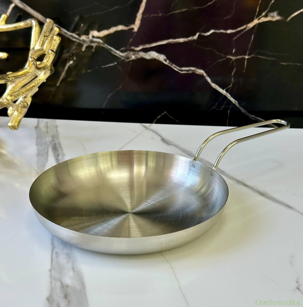 Сковорода виготовлена зі сталі SUS304 — японського аналога харчової нержавіючої сталі AISI 304 з вмістом 18% хрому і 8% нікелю. Корпус і ручка мають класичне матове сріблясте покриття, характерне для професійного кухонного посуду. Діаметр 20 см розрахований на індивідуальну порцію — страва подається на стіл безпосередньо у сковороді.